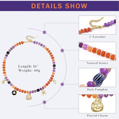 More information about KissYan Halloween Beaded Charm Necklace, Natural Gemstone Choker with 14K Gold Plated Pumpkin Witch Pendant Party Costume Dress Up Jewelry for Women