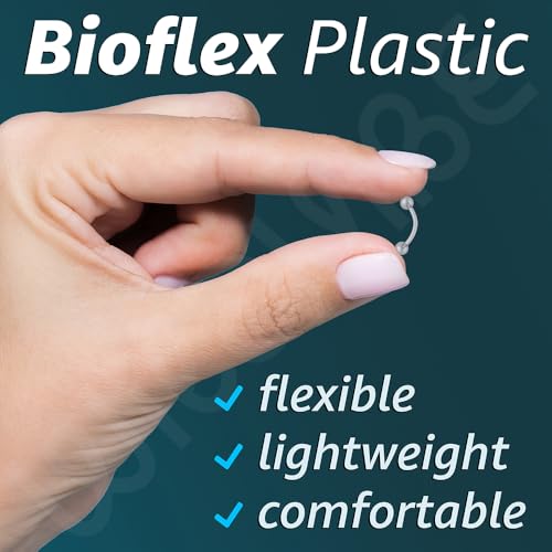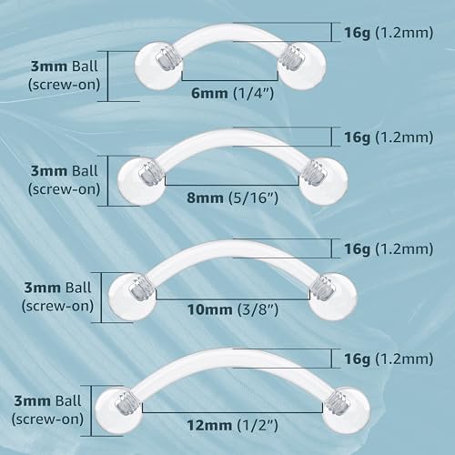 • EYEBROW: These flexible eyebrow rings clear come in lengths of 8mm, 10mm, 12mm clear 16 gauge bars. Each plastic eyebrow piercing retainer has secure screw balls that unscrew from both ends making fitting your clear piercing jewelry very easy and convenient. These 16g retainer curved are ideal when you need to remove your metal jewelry for any period of time.