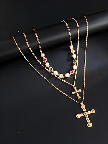 Gold Layered Cross Necklace Set For Women, Vintage Pearl Beaded Choker Colorful Rhinestone Crystal Statement Adjustable Chain Necklaces Holiday Anniversary Birthday Jewelry Gift 1