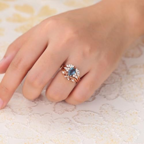 3Pcs Alexandrite Ring Set for Women,925 Sterling Silver Oval Cut Alexandrite Wedding Ring Set with Moissanite Gemstone Ring Set for Wife Wedding Promise Ring 5