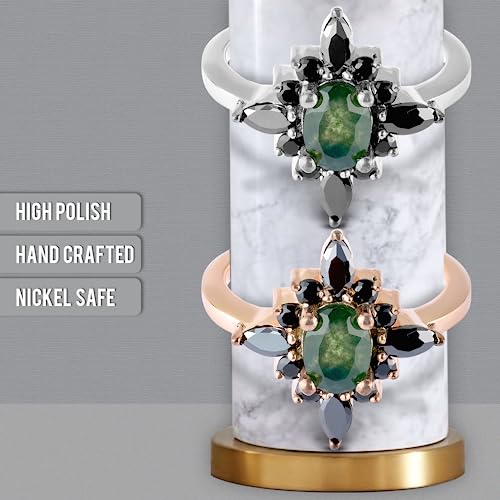 • FEATURES : Handmade Engagement Ring for Women, Hand Crafted in Solid 925 Sterling Silver with White and Rose Gold Two Rhodium Plating Colors. Detailed with Center Oval Cut Natural Moss Agate Surrounded by Marquise and Round Black Synthetic Onyx Gemstones. Moss Agate is Strong Enough to be Worn Daily and Makes an Excellent Choice for an Engagement Ring. This Ring has the Combination of Classic Fashion with Modern Flair, Always Gives You an Elegant and Stylish Look.