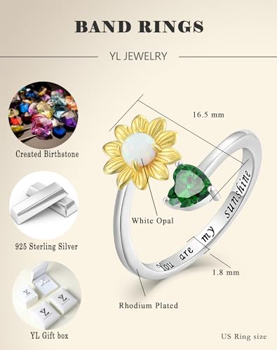 • Stunning YL Design: YL sunflower open rings is similar to the sun, symbolize warmth strength and positive happiness, keeping special words of love and hope, "You are my sunshine" close to her heart. 5 mm heart-brilliant-cut created green emerald and 4 mm round cut created white opal are skillfully set in yl bypass sunshine ring bands