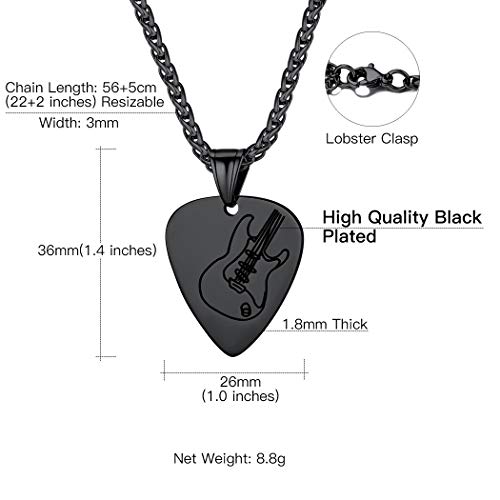 • GUITAR PICK NECKLACE -- Black plated stainless steel guitar pick necklace with a spiga wheat chain. Charm Size: 36mm*26mm*1.8mm; Chain Length: 22 inches+2 inches extender /Resizable to fit for anyone.