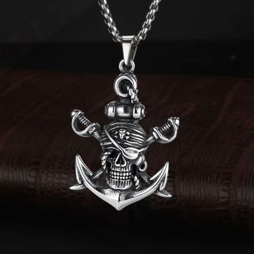 More information about PINK TOWN Gothic Pirate Skull Pendant Necklace With Skull Head, Ship Anchor, Double Sword - Stainless Steel For Men & Women
