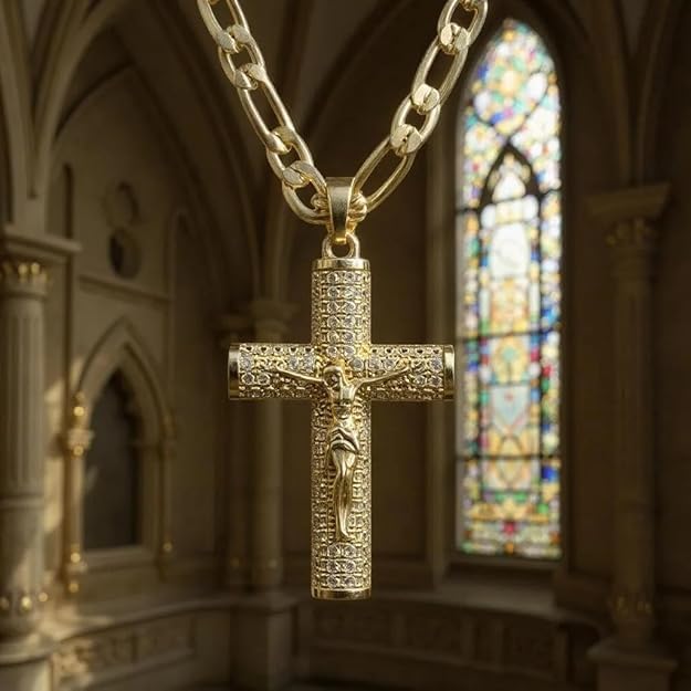 • ✝️ STUNNING DESIGN – Features a bling crystal-adorned Jesus Christ Cross Crucifix pendant that reflects both religious devotion and fashionable flair. Crafted from solid brass and finished with 14K gold plating for a luxurious shine and lasting durability.