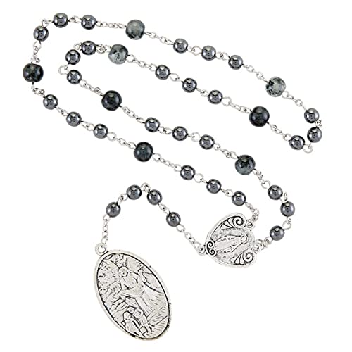 • ST MICHAEL THE ARCHANGEL PRAYER NECKLACE consists of 4 introductory Hematite 6mm Beads, followed by 9 groups of 3 beads separated by an 8mm Our Father Hematite BeadBEAUTIFUL DETAILS: Pendant has a Silver Metal St Michael the Archangel Dangle and a Miraculous medal CenterpieceST MICAHEL PRAYER CARD: Trifold Prayer card includes a Classic St Michael the Archangel Image and the Recitation Instructions for the ChapletPRODCUT SPECIFICATION Chaplet is 15.5''L made of 6mm and 8mm Hematite Gray Round Beads with Silver tone Zinc Alloy chain, Centerpiece and Dangle Medal (1,75''H)GREAT GIFT Packed in a two piece Acrylic Box for Safe-Keeping and easy Giving-Great spiritual gift for anyone who has a special devotion to St Michael Makes a Great Catholic First Communion, Confirmation or RCIA Gift!Clasp type: Clasp-FreeUnit count: 1.0