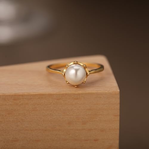 Pearl Ring for Women, 18K Gold Plated Womens Gold Rings for Bride Wedding Engagement Band Birthday Gold Rings Size 5 to 9 6