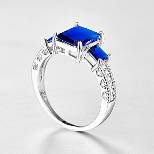 925 Sterling Silver Plated Emerald Cut Simulated Blue Sapphire Quatrz 3 Stone Promise Engagement Ring for Women 5