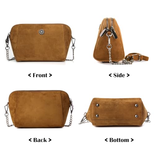 • Fashion-Forward Design: Featuring a sleek metallic dual-zip closure, a decorative floral metal button on the front, and anti-slip rivets on the bottom, this vegan suede purse blends practicality with style. The mixed metal chain/vegan leather strap and sturdy polyester lining showcase exquisite craftsmanship. A versatile must-have, it pairs seamlessly with any wardrobe
