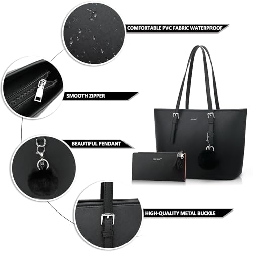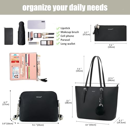 3PCS Handbags for Women Tote Bag Shoulder Bags Black Purses and Wallet Set Satchel Hobo for Work Travel 3