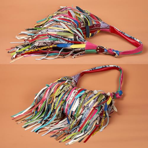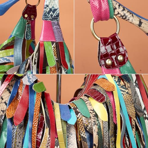 • 💗 Material: 100% genuine Sheepskin big RANDOM Patchwork COLORFUL hobo bag. A lots of Patchwork tassel stripe leisure shoulder bag design,Perfect large big size tote/handbag with plenty of room. Multicolour yet fashion; adjustable shoulder strap.