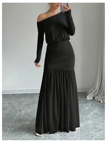 HOT ! Floerns Women's Mesh Off The Shoulder Dress Ruched Ruffle Long Sleeve Maxi Dresses