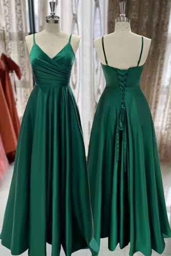 • Fabric type: Satin prom dress for teens featuring spaghetti straps and a corset back, two pockets on the side, v neckline, a-line style, floor length, elegant a line built-in bra simple ruched v neck formal dress