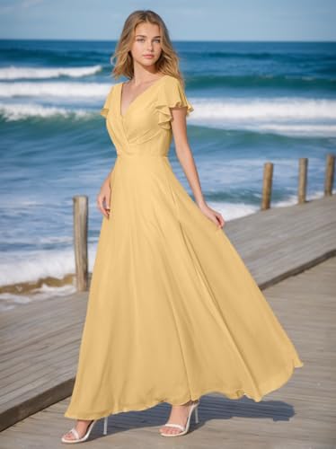 More information about Tvuyet Women's Elegant V Neck Bridesmaid Dresses for Wedding Long Chiffon Formal Dresses Ruffle Evening Party Dress 2025