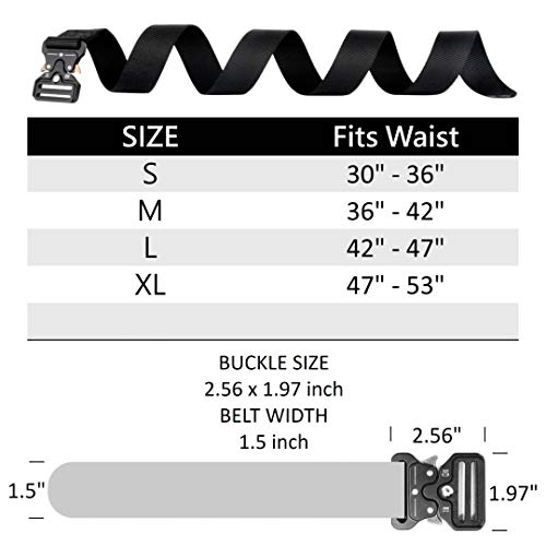 • Big & Tall Sizes Available: 2 Pcs Black Belt Length 45" (Fits 30 inchs, 32 inchs, 34 inchs, 36 inchs waist). Nylon belt width 1.5 inchs. Buckle size length 2.56", width 1.97", Please note that the tactical buckle cannot pass directly through most pants loops,Please wear it correctly according to the advertisement to ensure that the belt can pass through smoothly.