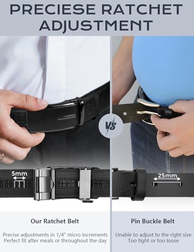 • PRECIESE RATCHET ADJUSTMENT - Our black leather belt comes with ratchet track system, allows for precise adjustments in 1/4 inch micro increments(4 times precise adjustment than traditional belts), ensuring slight adjustment for a comfortable fit after meals or throughout the day.