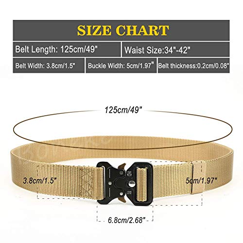 • 【Tactical Belt Size】:Length: 49”(125cm), Width:1.5”(3.8cm), fits waist 34"~ 42". Buckle Size: 1.97"(5cm) in width and 5/16"(8mm) in thickness.