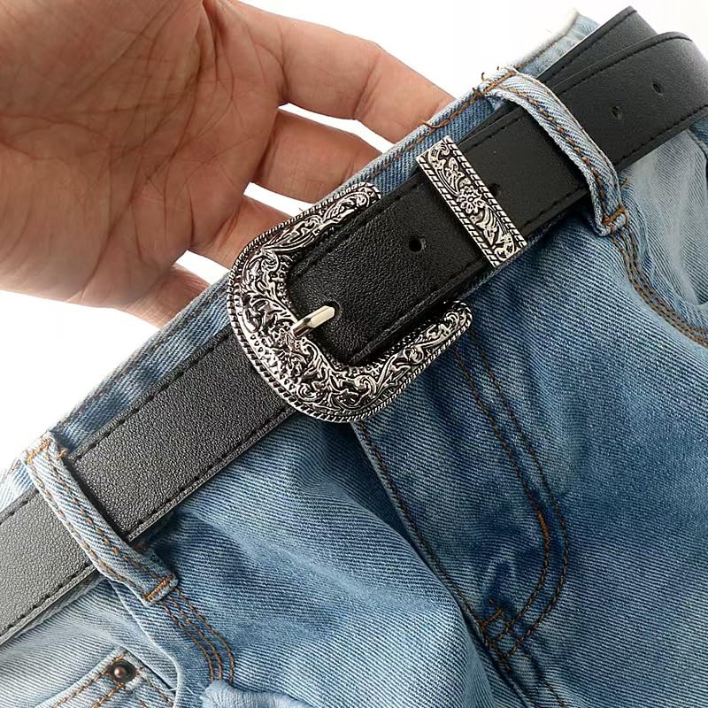 Women's Vintage Western Tooled Design | Adjustable Black Waist Belt for Jeans, Pants, Dresses with Solid Pin Buckle 2