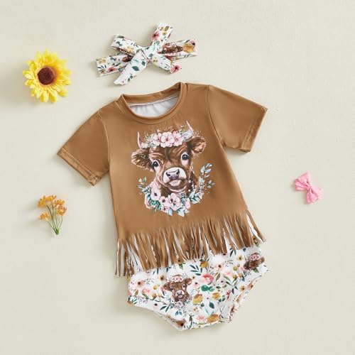 Infant Toddler Western Baby Girl Outfit Cowgirl Tassel T-Shirt Top Cow Print Bloomer Shorts Set Cute Country Clothes 1