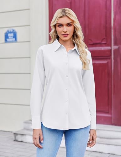 • Fabric: If you're looking for a trendy white button down shirt women that combines comfort, style, and practicality, these women's wrinkle free shirts are a fantastic choice. For women on the go, this feature is invaluable. No more stressing over ironing before meetings or after a long day—these stylish button down shirts for women stay smooth and polished, making them perfect for busy mornings and hectic schedules