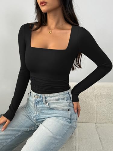 More information about Trendy Queen Womens Long Sleeve Shirts Crop Tops Basic Square Neck Going Out Fall Fashion 2025 Fitted Clothes Workout Outfits