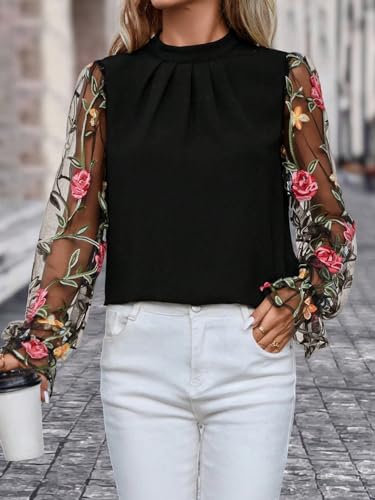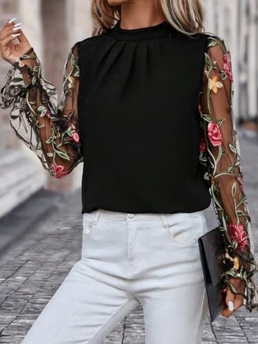 HOT ! Floerns Women's Floral Embroidery Mesh Mock Neck Flare Long Sleeve Blouse Top