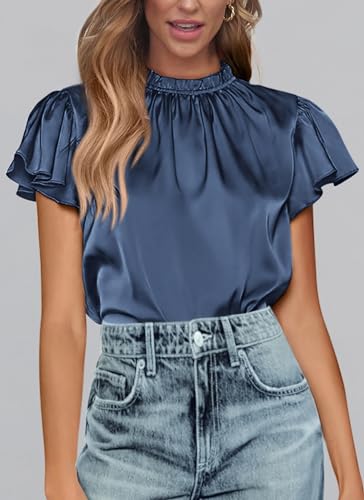 • ELEGANT SILKY BLOUSE: The Short Sleeves Make them Ideal for Warmer Seasons and it Can Be Layered with Jackets and Coats. The Crewneck Design Adds a Touch of Sophistication. Relaxed Cut Offers Comfort and Ease of Movement throughout the Day. The Ruffles Add Flair and Charm to the Blouse, Giving it a Playful and Stylish Touch that Elevates your Outfit