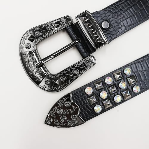 Studded Embossed Belt Crocodile Pattern, Metal Punk Rock Rivet Strap with Bright Pyramid & Crystal for Women Men 3