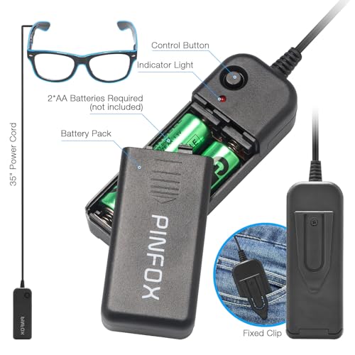 • BATTERY-POWERED: Glasses wired with a battery pack ( NOT CORDLESS ). Independent battery pack with two 1.5V AA dry batteries can provide the adequate power to ensure a longer continuous light up time (two hours at least depending on your battery capacity used). The pack and glasses are connected by a 35" wire. You can easily hide the pack in your pocket, clothing or chip in belt by the clip of the pack.