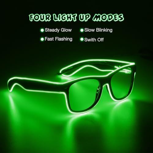 • FLASHING CAPABILITY: Single-button designed illumination makes these glasses an Must-Have accessory for any festive gathering. Press the button on the battery pack to change four modes: steady glow / blinking / FLASHING / off.