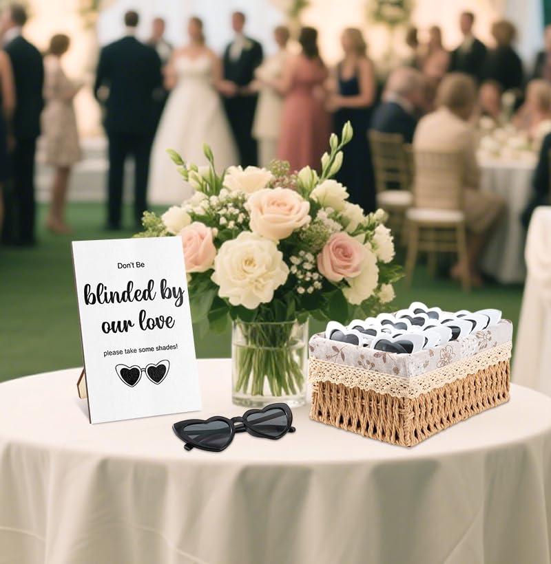 • Complete Package Deal: Includes 50 pairs of sunglasses plus a custom wooden sign (13 x 20cm/5.12×7.87in) reading "Don't Be Blinaled By Our Love Please Take Some Shades!"—perfect for memorable photo ops at your event.