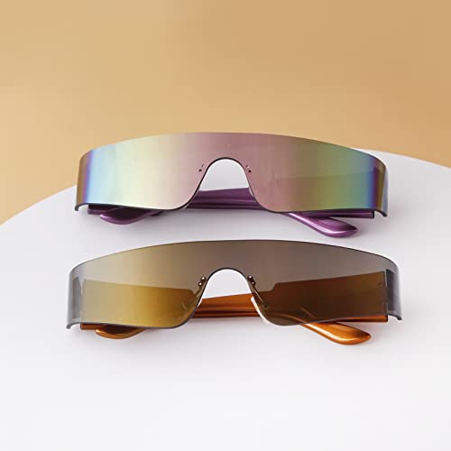 • TRENDY FUTURISTIC DESIGN - Stylish rimless silver future y2k sunglasses. Flat top Sunglasses with a one-piece futuristic design and striking volumes, bold wrap around rims and lively mirrored define this sunnies, give these sunglasses stylish and futuristic sci-fi style shades. UV400 lenses reduce reflections and enhance contrast, reducing glare and eye strain. To protect your eyes from harmful UV rays, these sunglasses include lenses that are coated with UV protection