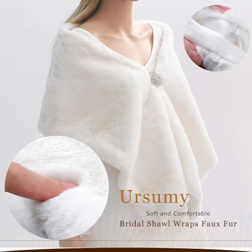 HOT ! Ursumy Women's Wedding Faux Fur Wraps Bridal Shawl Fur Stole Fur Scarf with Rhinestones Brooch for Bride and Bridesmaids