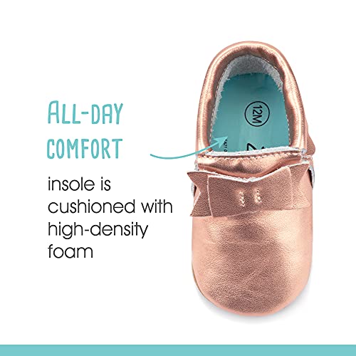 • STAYS ON YOUR BABY'S FEET: These baby shoes stay on your little one's feet! Our stay-on baby moccasins for girls and boys slip on and stay on with gentle elastic at the ankles, keeping lost socks to a minimum. Whether your baby is busy walking, crawling, or cruising around, you won't need to keep picking up those pesky baby socks!