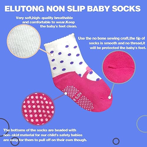 • SUITABLE AGE: Elutong baby grip Socks for fit 0-12months 1-3T 3-5T 5-7T baby new born infant toddler. 12 pairs of grips socks would be allowed your baby girl to always have clean socks to replace and keep their feet clean.A variety of colors and tyles will certainly make it easy for you to match them with all kinds of good-looking clothes
