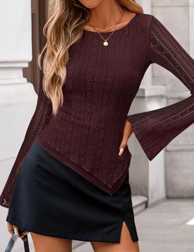 HOT ! ZESICA Womens Lace Mesh Long Sleeve Shirts Fall Double Lined Boat Neck Slim Fit Asymmetrical Going Out Tops Date Night Outfit