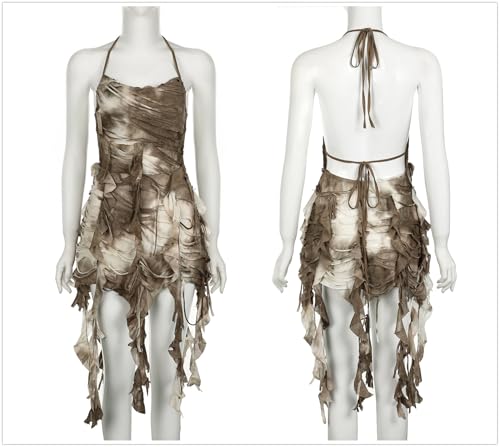 • Embrace a grunge look with this brown ripped halter cami tank top, great for Y2K and rave fashion styles.