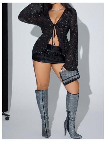 SHENHE Women's Plus Size Tie Front Sheer Mesh Top Bell Sleeve Ruffle Sparkly Sequin Party Shirt 3