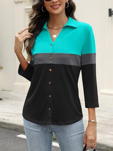 ORANDESIGNE Women's Button Down Shirts 3/4 Length Sleeve Polo Collared Tops Business Casual Color Block Summer Tees 3