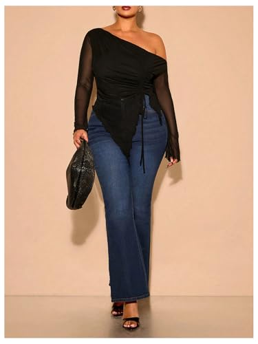 SOLY HUX Women's Plus Size Mesh T Shirt Off The Shoulder Long Sleeve Sheer Tee Ruched Drawstring Asymmetrical Hem Tops 5