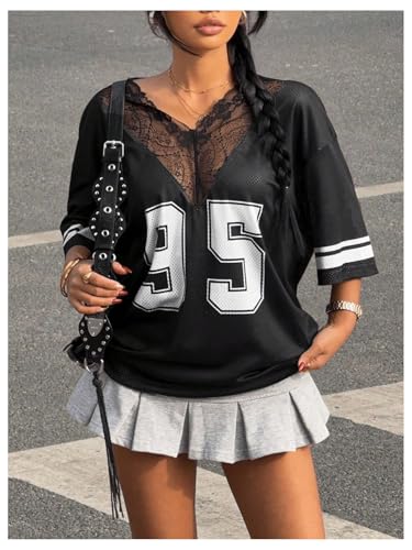 More information about SweatyRocks Women's Half Sleeve Loose T Shirt Lace V Neck Graphic Tee Number Shirt