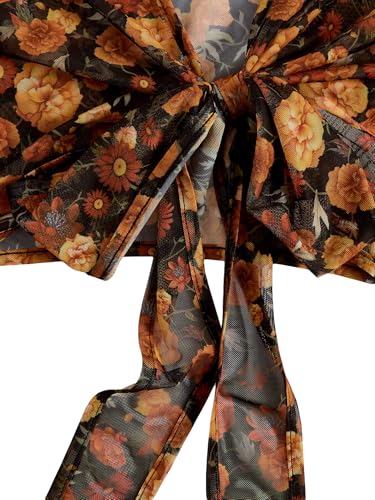 Verdusa Women's 70s Floral Print Tie Front Mesh Cover Up Long Bell Sleeve V Neck Crop Boho Blouse 1
