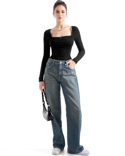 HOT ! SUUKSESS Women Square Neck Ribbed Long Sleeve Shirts Lace Trim Y2k Crop Top
