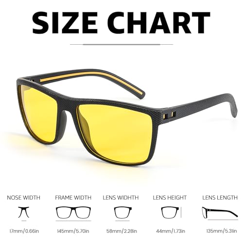 • ANTI GLARE GLASSES NIGHT DRIVING: Polarized yellow-tinted lenses effectively reduce driving glare and minimize eye fatigue; they ensure optimal safety during nighttime journeys. Say goodbye to compromised visibility and hello to a safer driving experience with night-vision glasses.