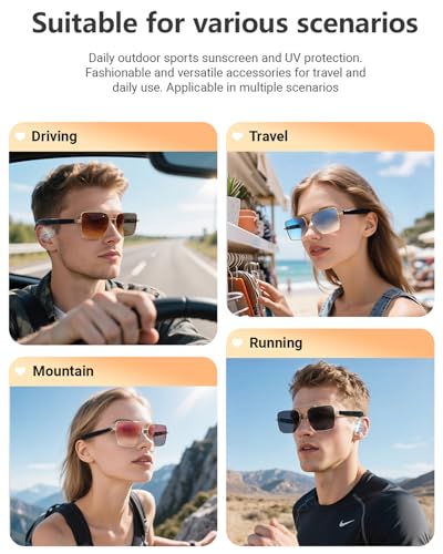• Smart Audio Experience: Seamlessly connect with these Smart Sunglasses for Men Women featuring Bluetooth 5.4 technology for hands-free calls, music streaming, and voice assistant access – perfect for active lifestyles