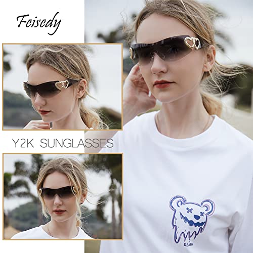 FEISEDY Y2K Rimless Sunglasses Heart for Women Men Around Wrap Fashion Futuristic 2000s Trendy Shield B2981 2