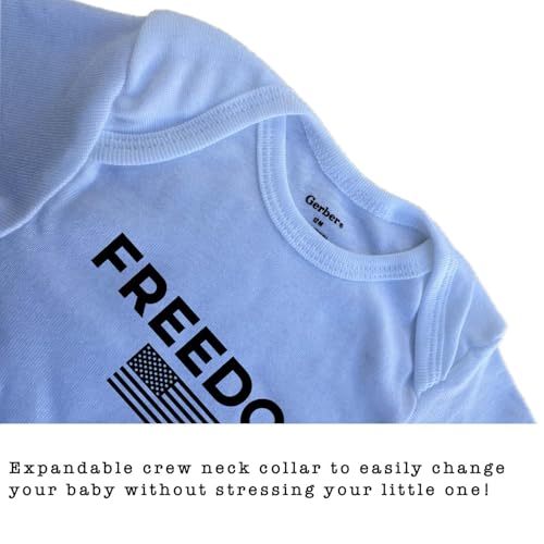 • GRAPHICS: We designed this patriotic onesie using a simple font that spells out Freedom with the monocolor american flag bellow the font. . This onesie features a screen printed Onesie. The onesie print is vibrant and were sure your friends and family are going to love this onesie on your little one!