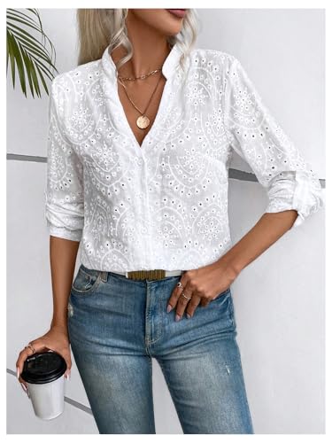 HOT ! SweatyRocks Women's Notched V Neck Roll Up Sleeve Button Down Eyelet Blouses Tops