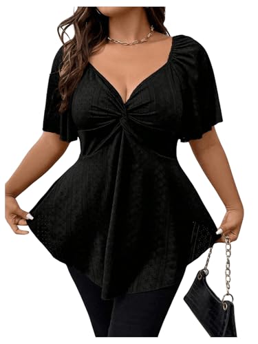 HOT ! OYOANGLE Women's Plus Size Twist Front Short Sleeve Sweetheart Neck Asymmetrical Hem Blouses Solid Peplum Tops