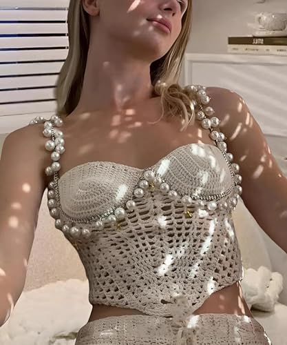 More information about Women's Sexy Pearl Crochet Crop Tops Hollow Out Strapless Cami Summer Beach Halter
